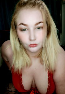 A young, attractive woman with blonde hair, blue eyes, and a seductive expression. She is wearing a red lingerie with a visible lace detail. The model appears to be in a well-lit indoor setting, possibly a bedroom or studio.
