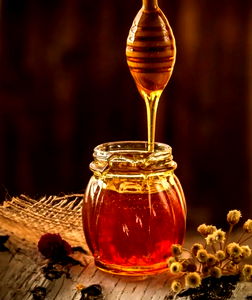 This image captures a moment of indulgence, featuring an artisanal honey jar filled to the brim with golden honey. The honey is dripping from the mouth of the jar onto the wooden surface beneath it, creating a visually appealing drip. The honey jar rests on a table, surrounded by natural elements like flowers and branches, hinting at its organic origin. The overall composition evokes a sense of rustic charm, with the honey jar as the focal point.