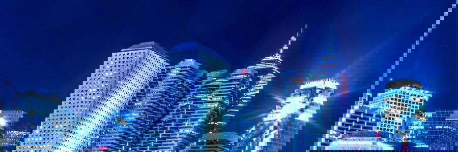 This image captures the vibrant energy of a bustling city at night, featuring illuminated high-rise buildings and a striking sky. The scene is framed by a long exposure shot from across the bay, highlighting the urban landscape and architectural beauty of this major metropolis.