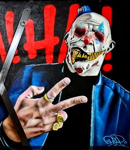 Striking wall art showcasing the vibrant and edgy style of Zavatrash. The piece prominently features a figure, likely representing Zavatrash himself, in a dynamic pose with expressive facial expressions. This urban artwork is a testament to the artist's skill in capturing movement and emotion.