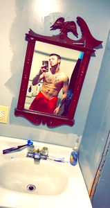 An image captures the shocking moment a popular Onlyfans model, ZBlueEyedz, is revealed to be a man. The photo, taken from the perspective of the bathroom mirror, shows the model standing shirtless with a playful expression. The background reveals typical bathroom elements such as a toothbrush holder and toiletries.