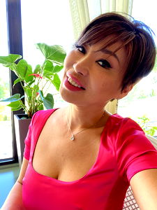 The image features a woman posing for the camera. She is wearing a red top and has short hair. Her expression is happy and confident, with a gentle smile on her face. In the background, there's a potted plant and what appears to be an indoor setting. The lighting in the photo suggests it might have been taken during daylight hours.